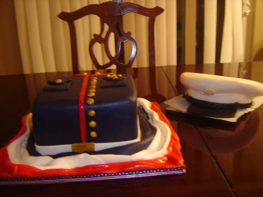 I made this for a friends brother in-law who leaving back to the Marine's. It's a chocolate kahluah fudge cake filled with rasberry ganasche. Covered in MMF. The hat is RKT....it was VERY tricky...I'm not happy with the hat but it was the best I could do. TFL