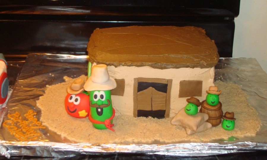 This was for my son's 3rd b-day. He really likes Veggie Tales, especially "Little Joe". I "borrowed" this idea from REDHEADCRUZ here on CC. Thanks for the inspiration! I used a 1/2 sheet cake, cut into quarters and stacked. I used the "Easy Yellow Cake" recipe posted by Serious_Cakes - excellent recipe BTW- filled with strawberry filling, iced with BC. All other decorations I did in MMF. SO MUCH FUN!!!