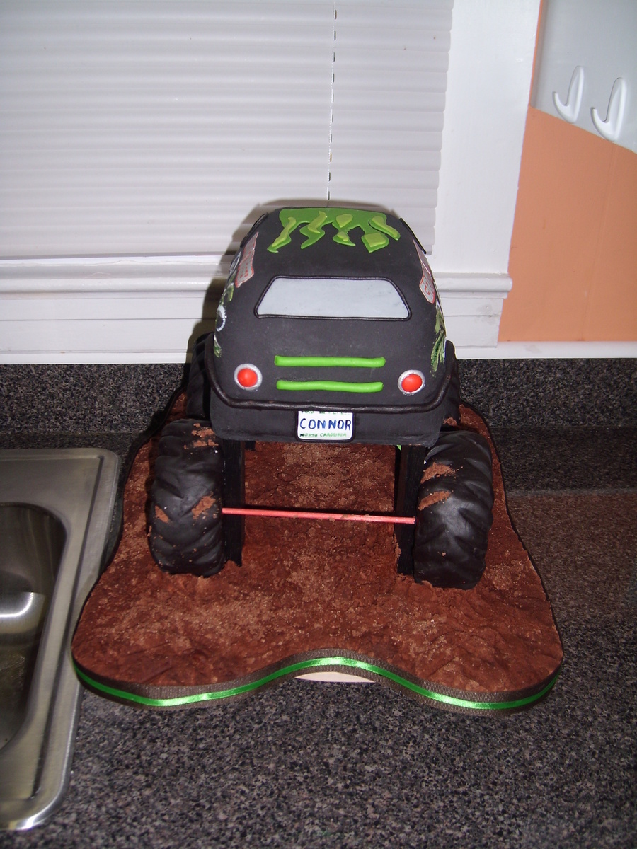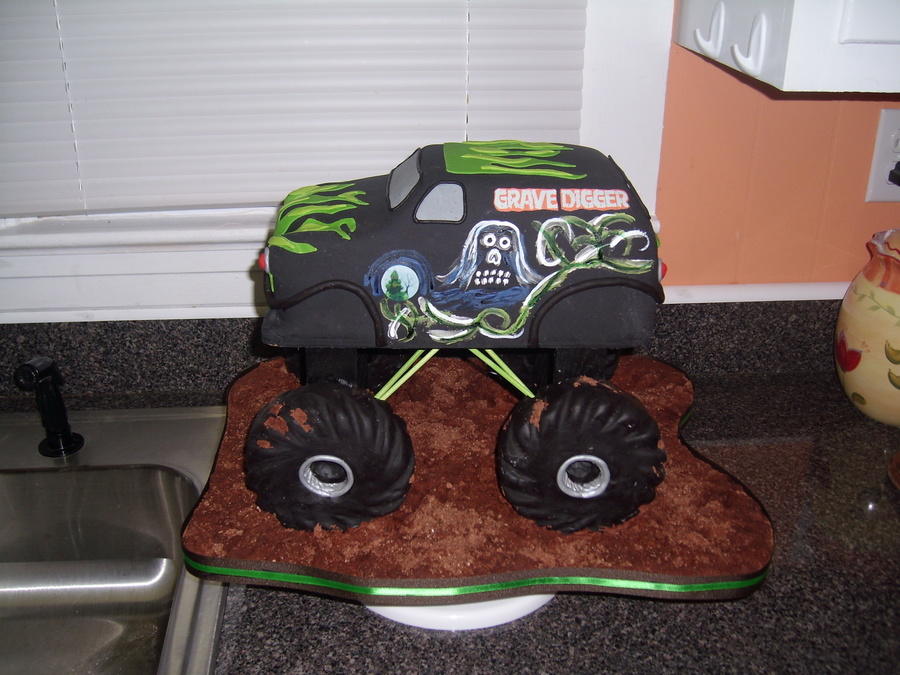 This is carved from a 9'' x 13'' White Almond Sour Cream cake. It's covered in fondant. The tires are Rice Krispy Treats covered in black modeling chocolate and the mud is royal icing with graham cracker crumbs mixed in. Thanks for looking.