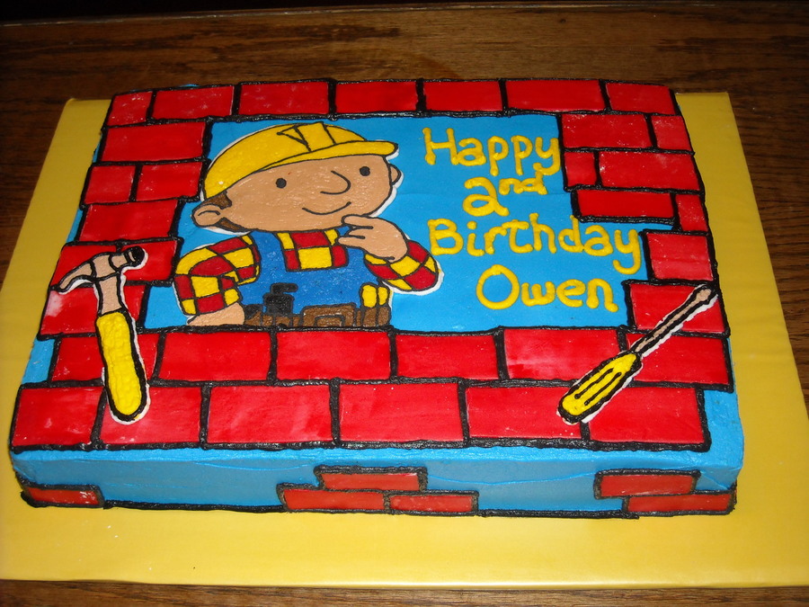 white cake. Bob is FBCT. Bricks are fondant. Thanks to KathleenR for inspiration.