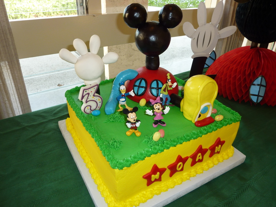 Mickey Mouse Club House Cake. Parts are made from Rice Crispy Treats covered in fondant.
