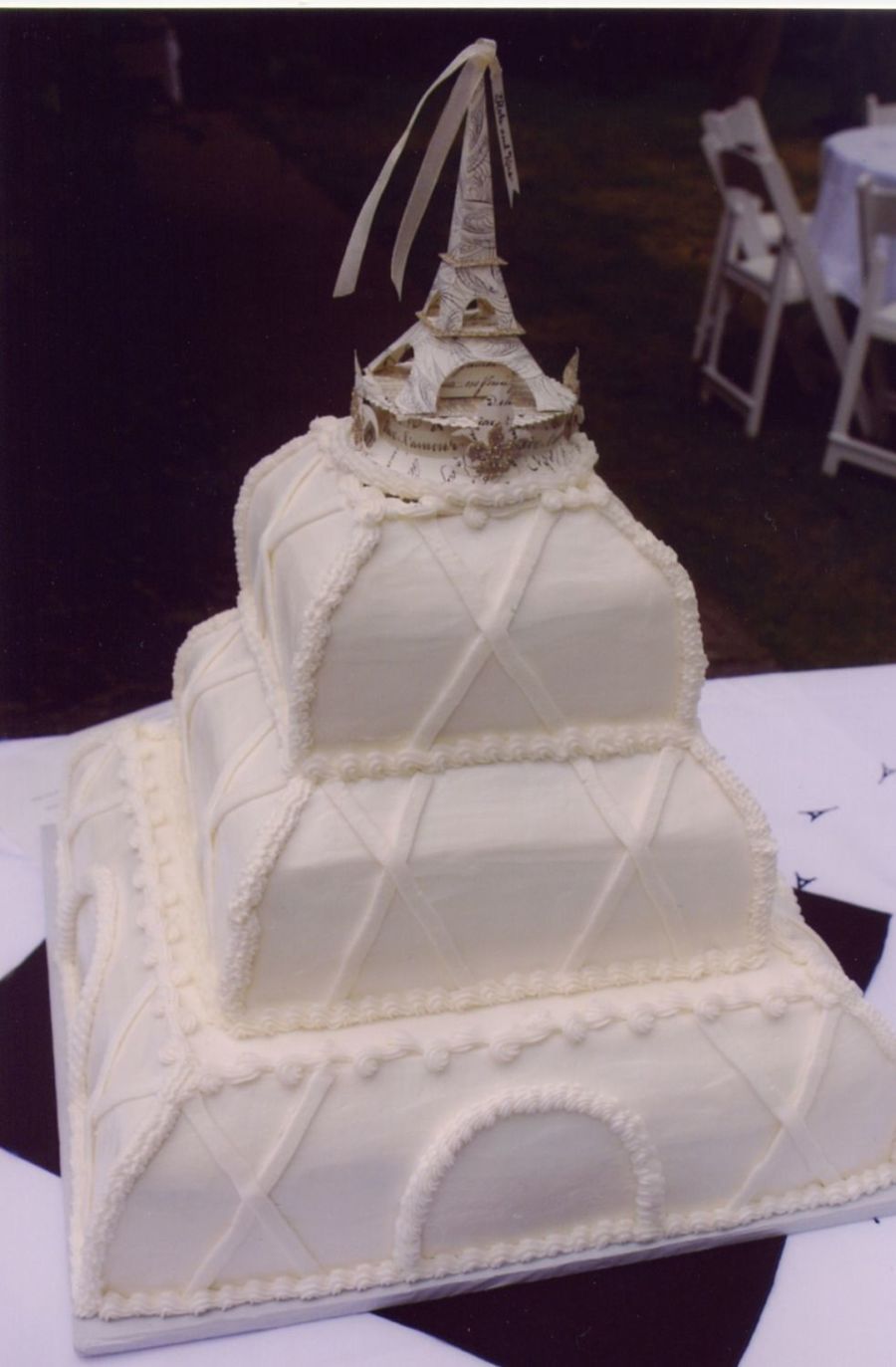 This design comes from a bridal magazine that originally showed it with rose pedals sprinkled along each tier and rose buds placed under the topper. However, the couple liked the contemporary feel given by the stark plainness and bold lines. It also helps to draw your eye to the intricate handmade topper that was purchased through the bridal magazine.