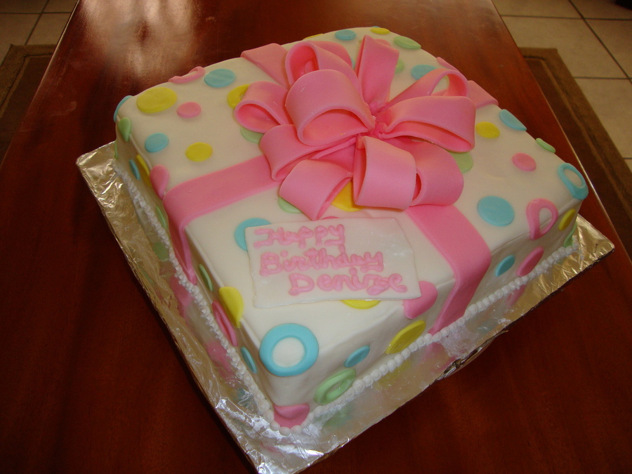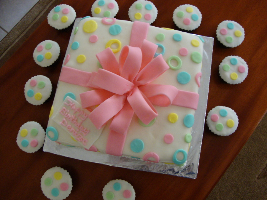 Gift Box MMF Covered cherry cake with Rolled fondant ribbon. The person this cake was specially done for was very pleased to have her gift cake with matching Chocolate cupcakes covered with Fondant. everyone who saw this cake thought it was pretty. Thanks for looking.