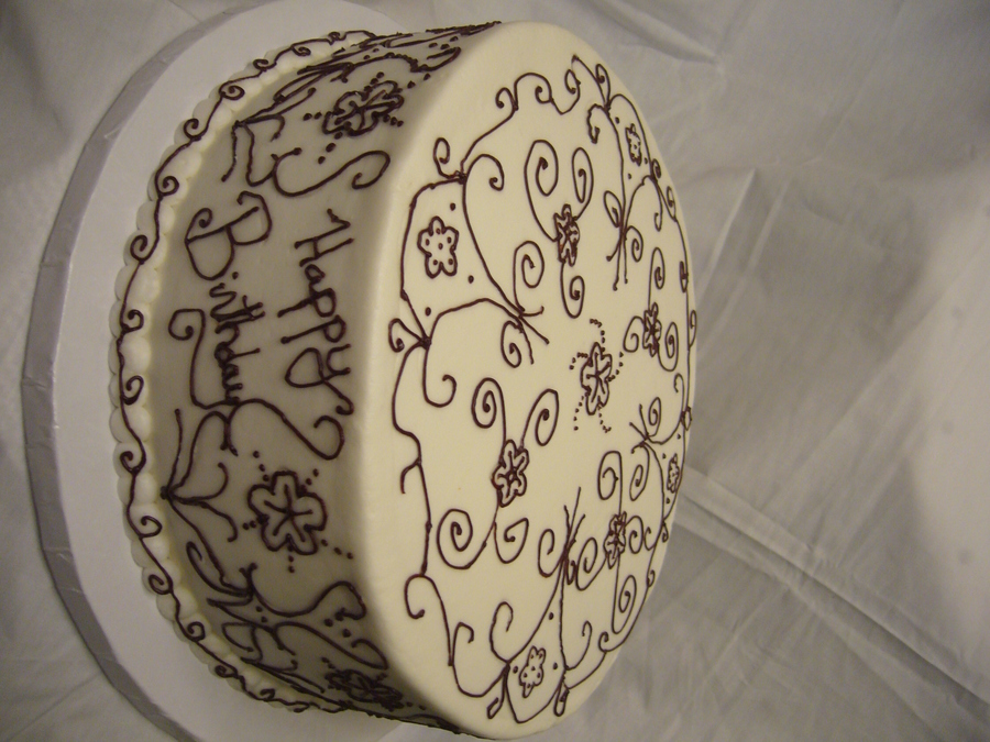 I used the wilton pattern press to mark simple designs around the cake then embellished them with more dots and designs. I was happy with the way it turned out.