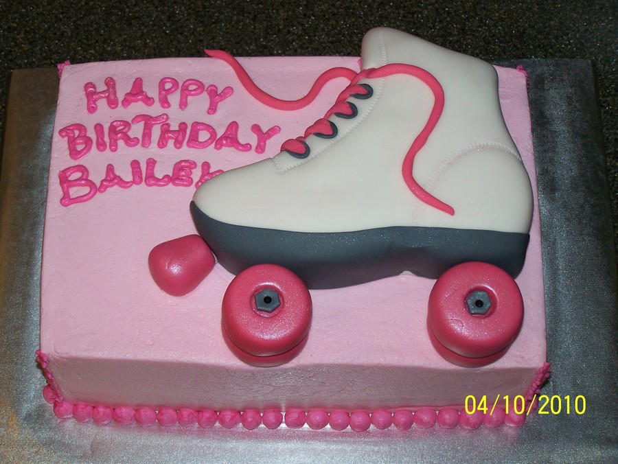 9 x 13 chocolate cake with butter cream icing. Skate made of cake and covered with fondant icing. Royal icing letters.