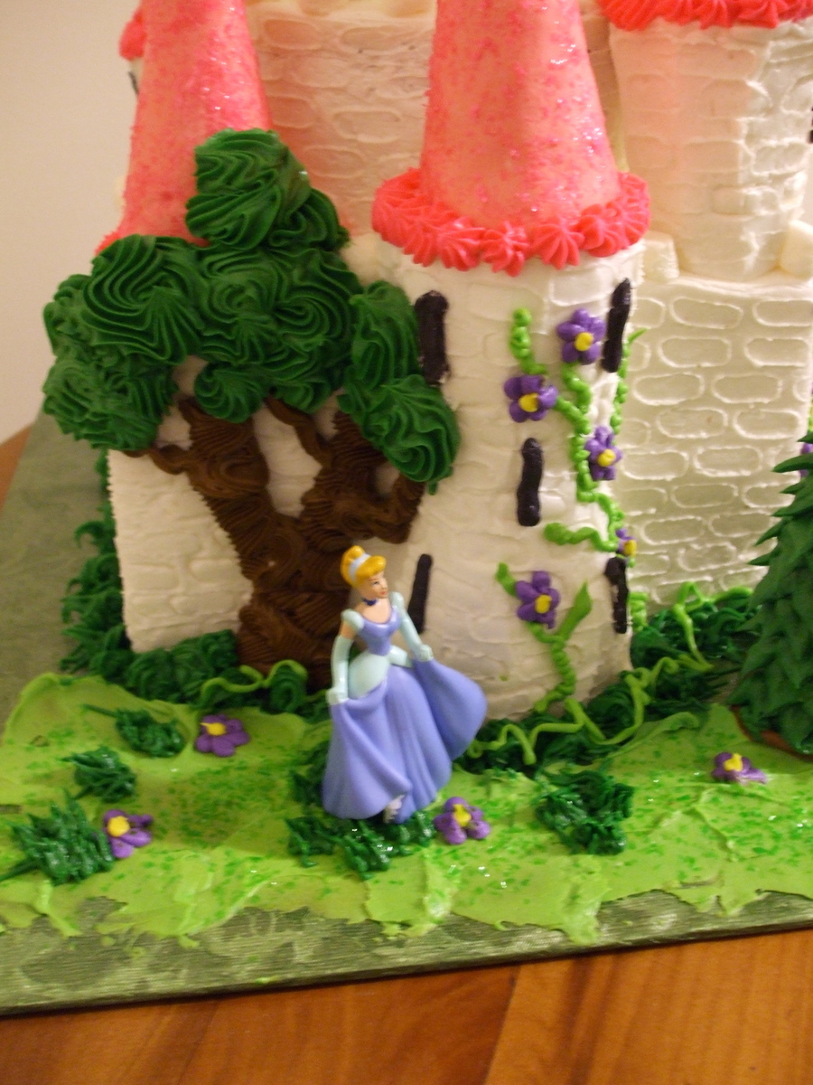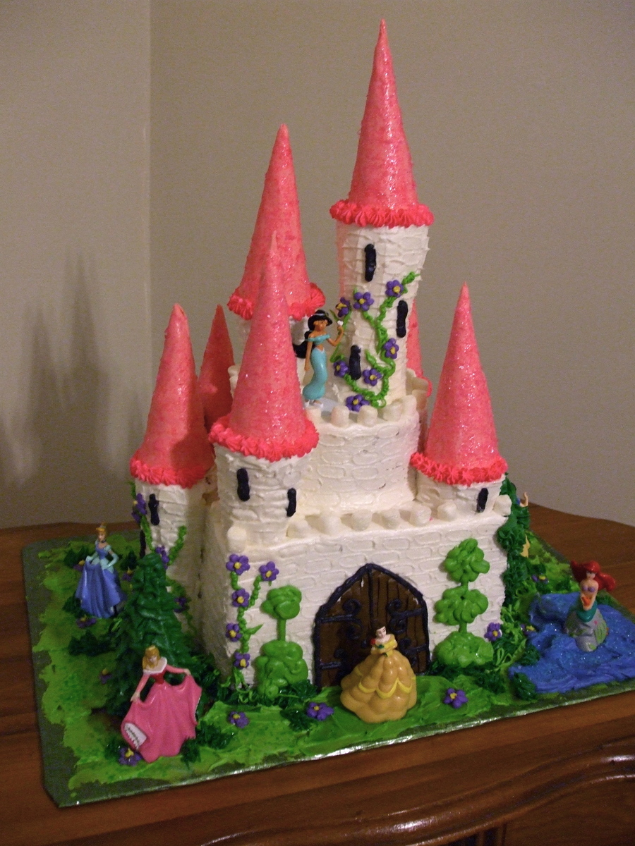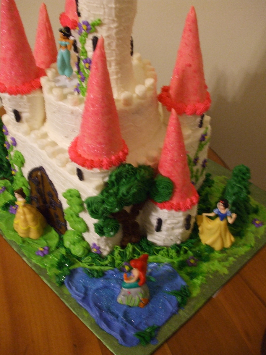 This cake was a blast to make! It's all edible except the figures and is mostly buttercream. The only fondant is on the rooftops. This is my second castle cake and the first one where I used cone towers. :)