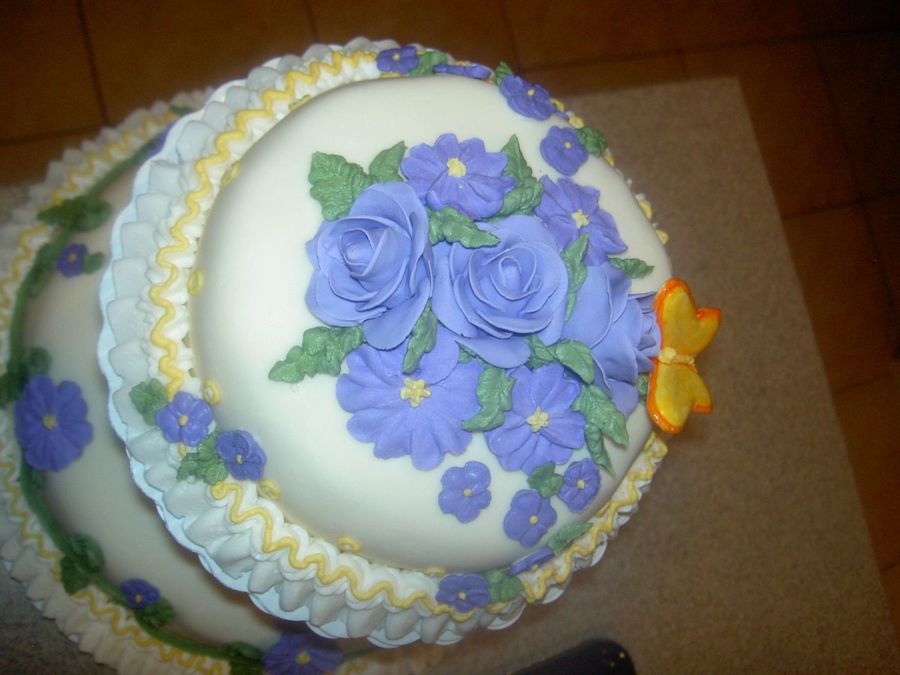 Fondant covered, with royal icing flowers & butterfly & fondant roses; buttercream leaves, ruffles & scroll designwork