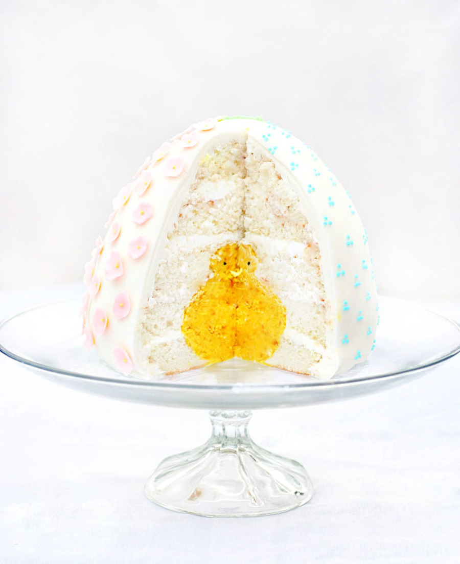 This cake is shaped like an egg and has a little chick inside!