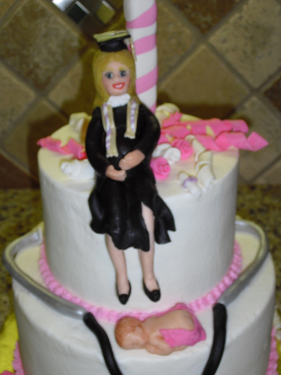 This cake was a catch all. The girl graduated college, had a baby, it was her birthday and she passed the physician assistants board exam. It was fun to incorporate all items. Chocolate with cookies and cream filling, bc icing.