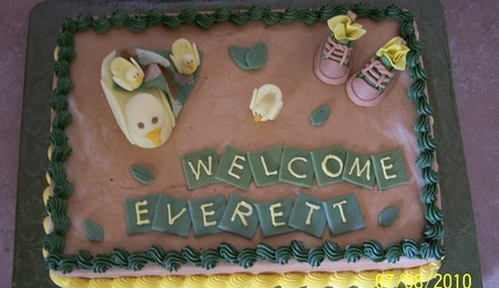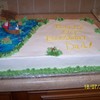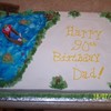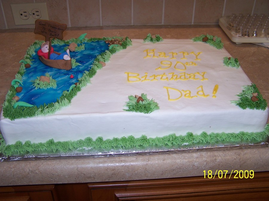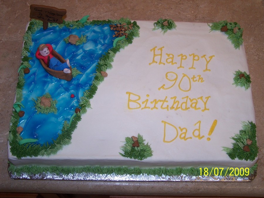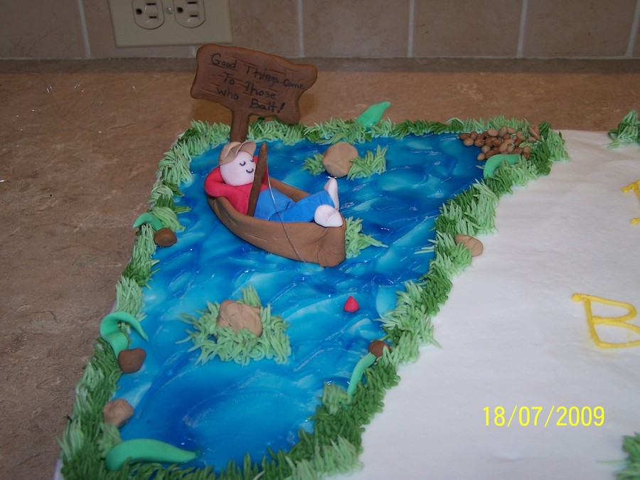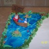 The fisherman, his boat, sign and rocks was made of 50/50 Gumpaste and Fondant the water is colored piping gel.