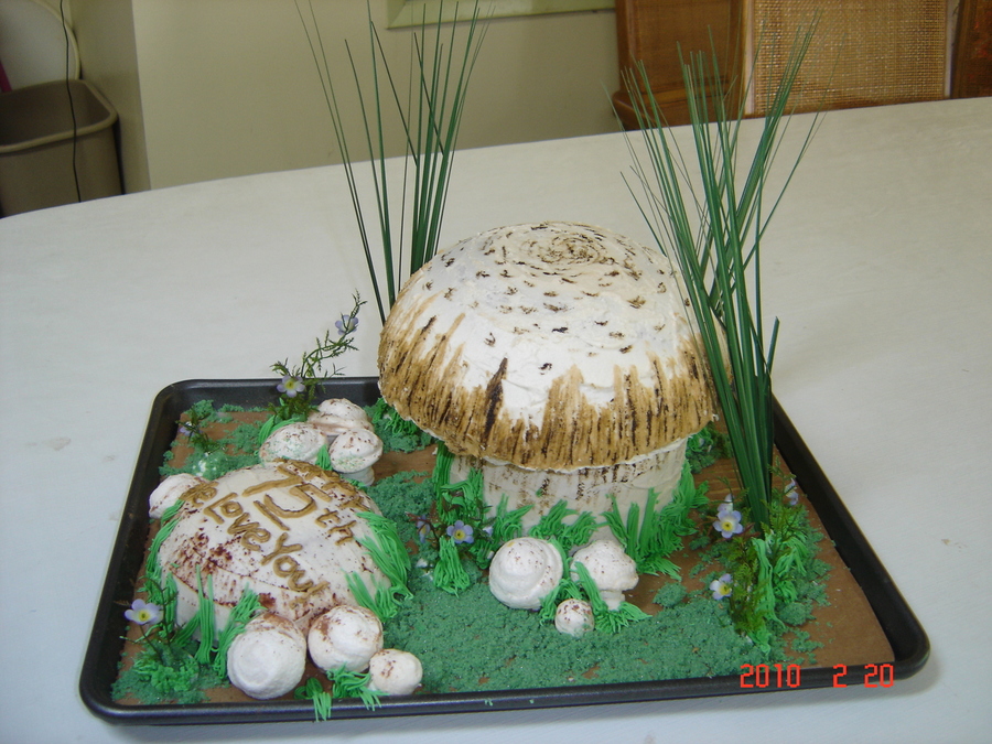 My first 3D cake. I a made this for my mother's 75th birthday. She loves mushrooms! large mushroom cap is chocolate, stem and puffball are lemon. Meringue mushroom accents. All but the large grass/flower bits are edible. And so the addiction began....