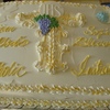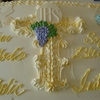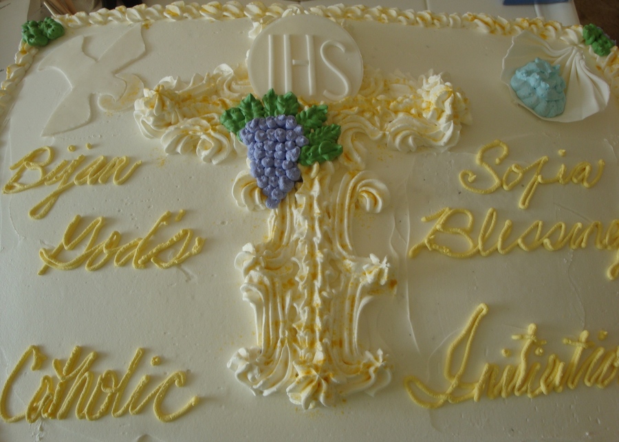 This cake represents the Initiation into the Catholic Church. It symbolizes Baptism (Shell & Water); First Communion (the Host); and Confirmation (the Dove soaring downward). It was a joy to make and it came out beautiful. :)