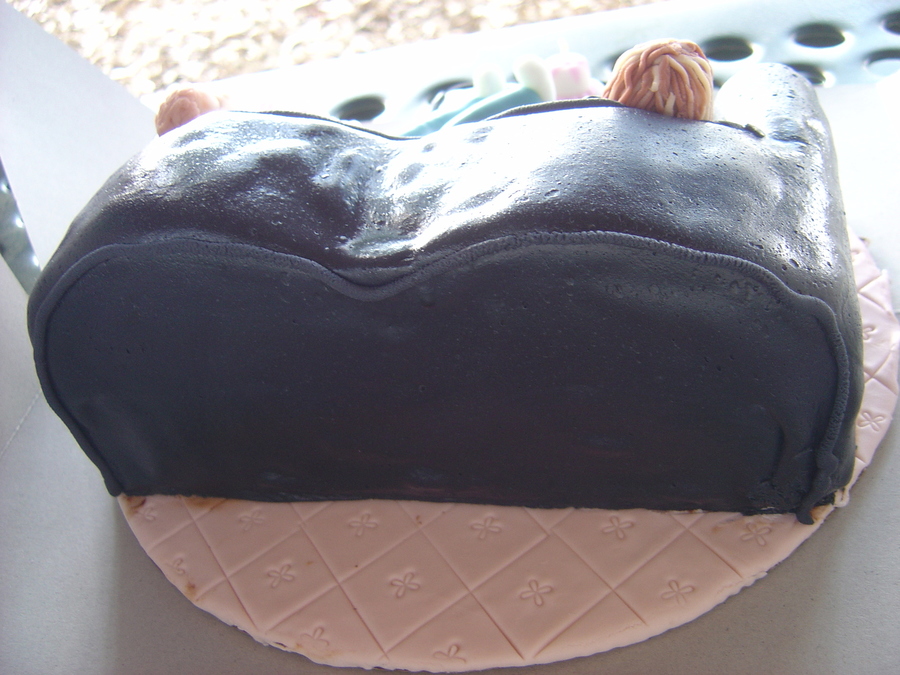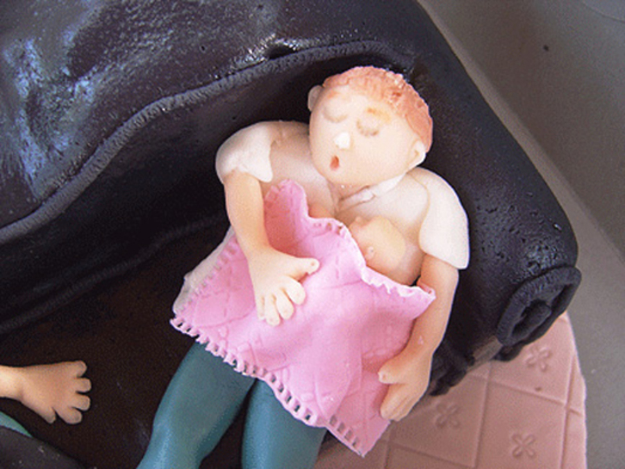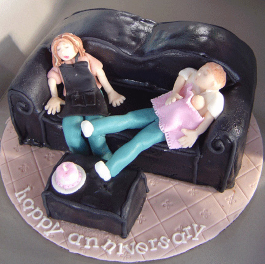 Anniversary cake for my BIL/SIL with new baby. Chocolate cake covered in ganache and fondant. All characters fondant/Tylose. Tough to keep ganache from spreading out at bottom. Lots of bubbles under fondant but had only a few minutes to finish. Good thing it was only for family!