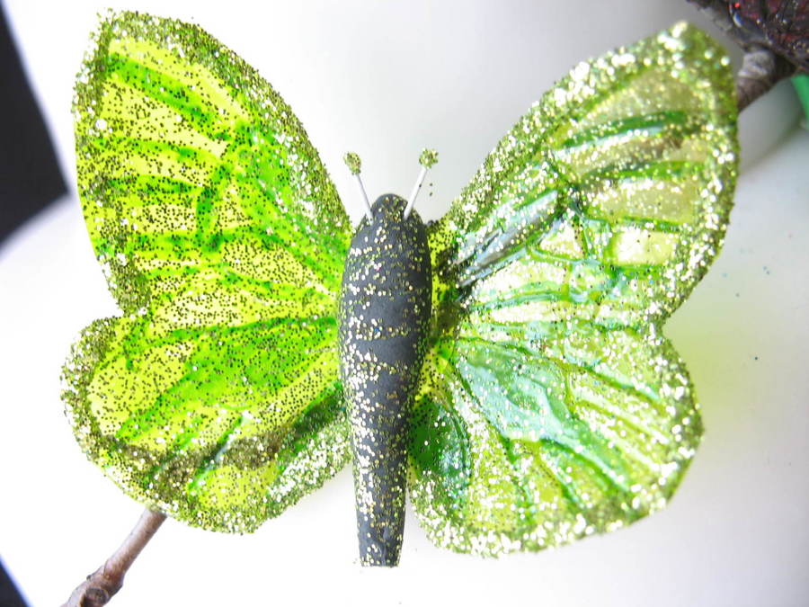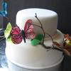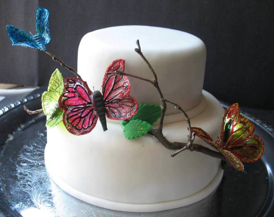 Fondant-covered dummy cake for a class - first time making gelatin butterflies. The branch is real, butterflies were made using a veiner sheet, painted with gel color/vodka and then decorated with glitter.