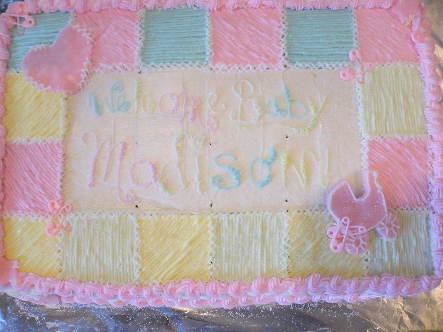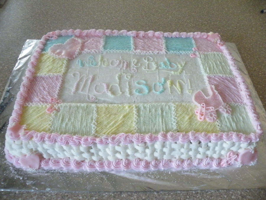 This is my 2nd baby shower cake :) i tried to kinda copy the napkins. its mostly buttercream other than the cut outs are fondant. i really liked how it turned out :) i thought it was really cute.
