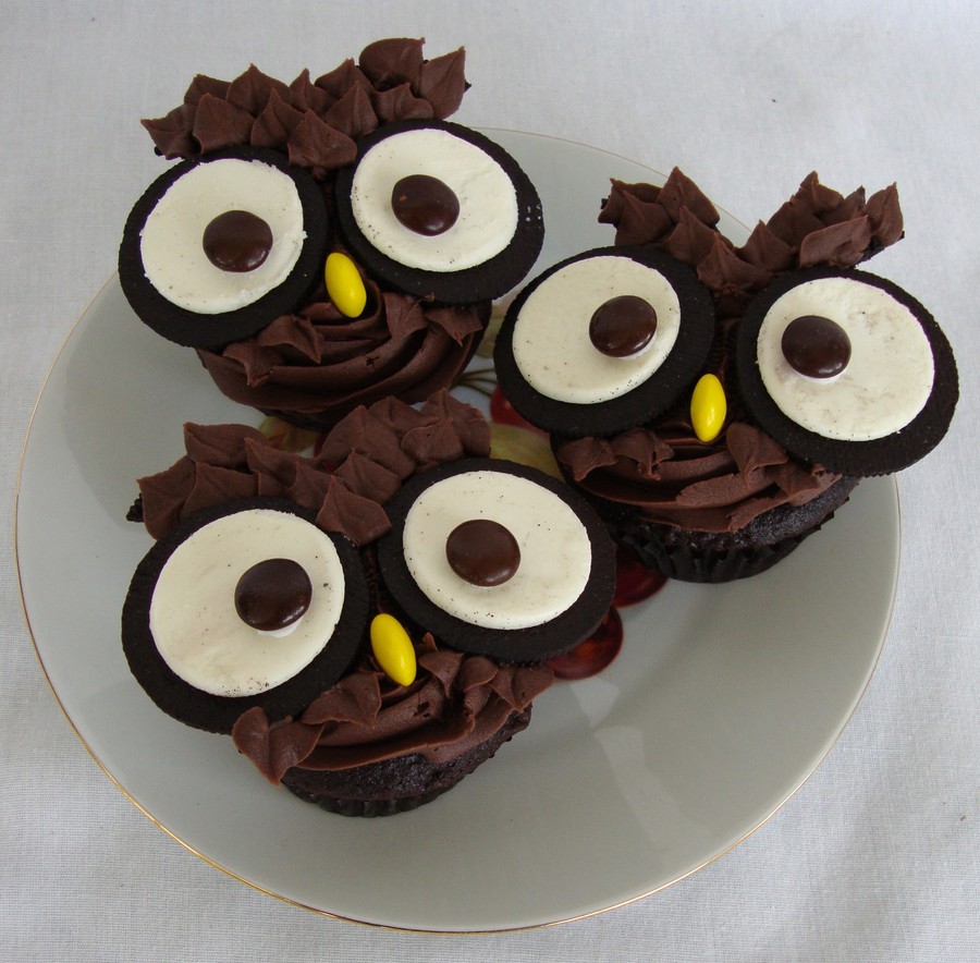 an order of 24 of these cute owl cupcakes from the popular book, using oreos for eyes, 1/2 oreos for eyebrows, and m&m's for eyes and beak