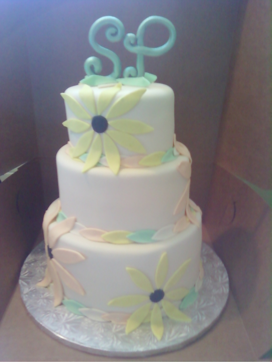 3 tier Choc/Van/Choc - BC icing with all fondant accents. initials are Gumpaste and painted with Glitter dust.