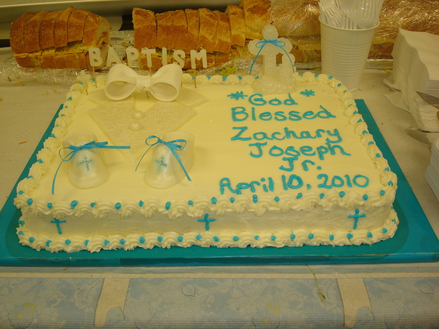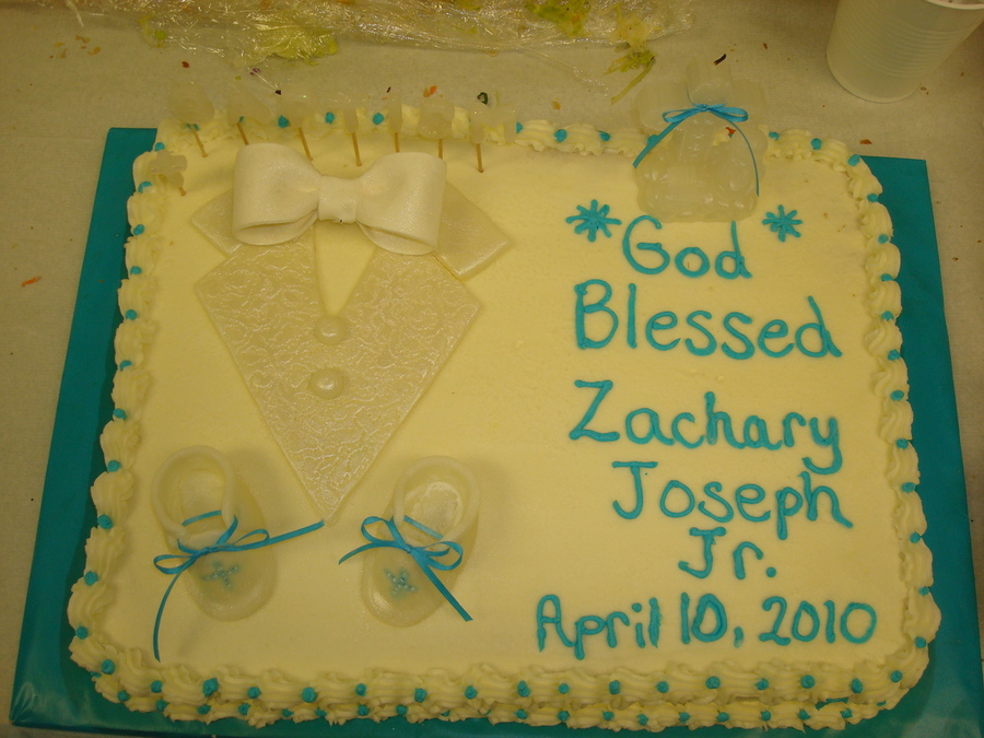 I did this cake for my son's baptism. I got some ideas from others on CC..thanks to all! I tried to make the tuxedo to match his outfit (fondant) booties (fondant) bowtie (gum paste) Its white cake with chocolate ganache and buttercream icing...the recipes I got off of CC!