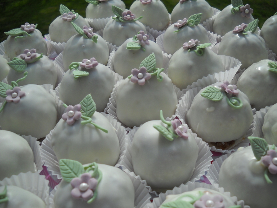 carrot cake balls -decorated with fondant flowers and sugar pearls