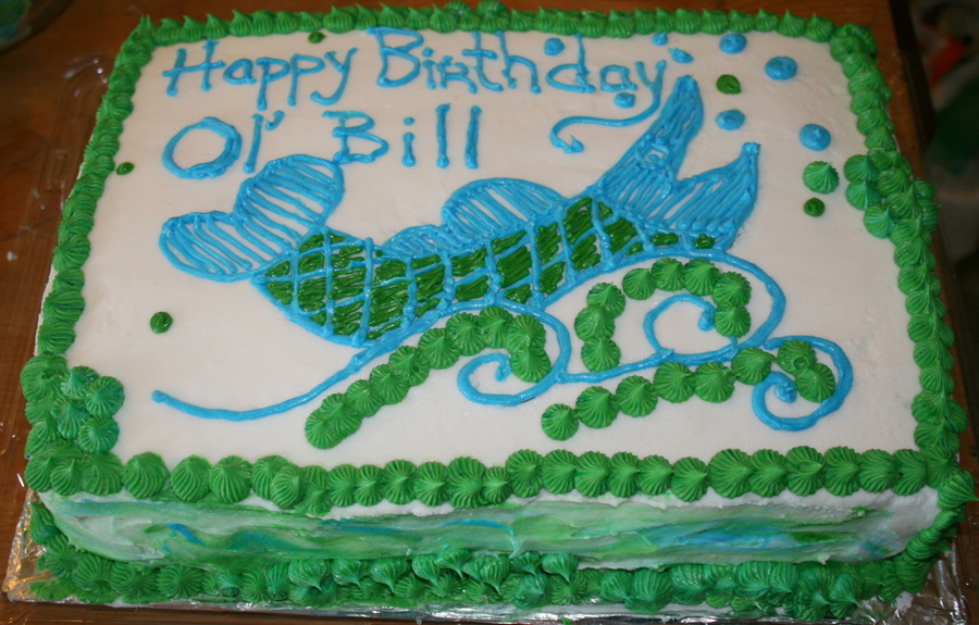 A cake made for friend. the green drops all over the cake represent barnacles like the ones on his boat.