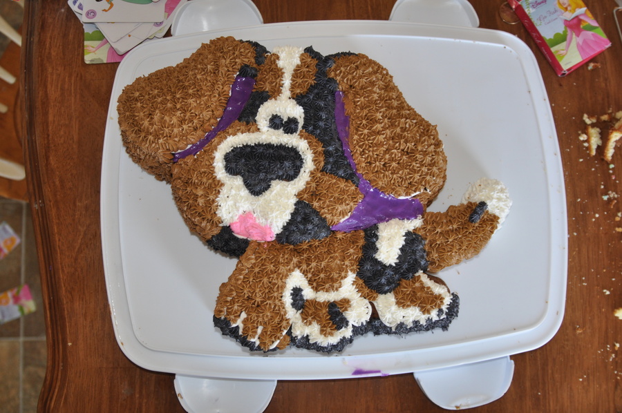 Made this for a little boy who wanted a beagle cake for his birthday. It is designed to resemble the colouring of his own beagle. Modified Blues Clues shape pan with buttercream frosting.
