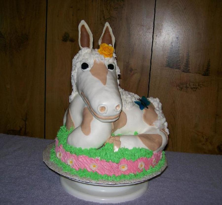 Strawberry cake with strawberry filling. Carved pony from egg pan and two oval stacked. Sitting top of 12'' round pan. Pony covered with MMF , head/legs - RKT. Candy clay rose and ears. Gelatin butterfly. Grass and mane/tail buttercream.