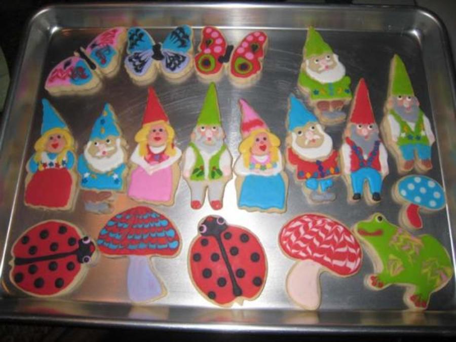I did these Gnome cookies last summer. The girl and guy gnome in the middle left row are made with Hammer Song cookie cutters (love them, very fun cutters) and the taller guy gnome is a cutter widely available. I have since had a baby gnome cutter made, but I haven't used it yet. I think it's time to bake some again!