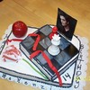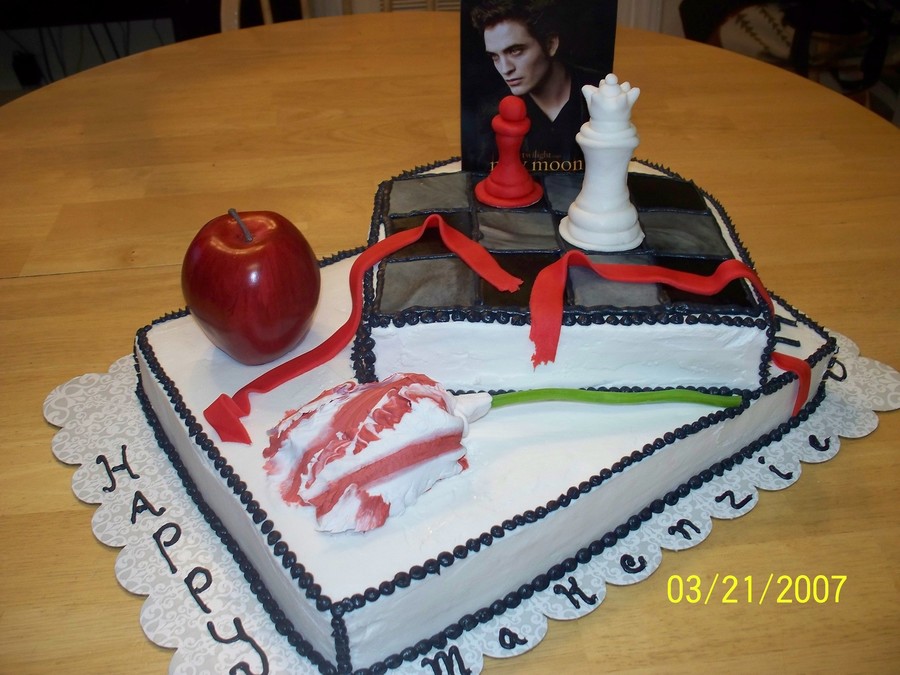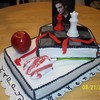 I made this cake with ideas from other CC photos ~ thanks~! It was made for a 14 year old who is crazy about twilight. Butter cream icing is the base. I used fondant for the chess pieces, chess board and the ribbon. For the flower I used gum paste and I ran out of time for the apple so it is a fake store bought one. The picture of Edward is a post card we got from a friend.