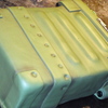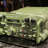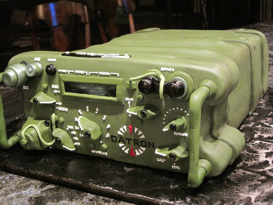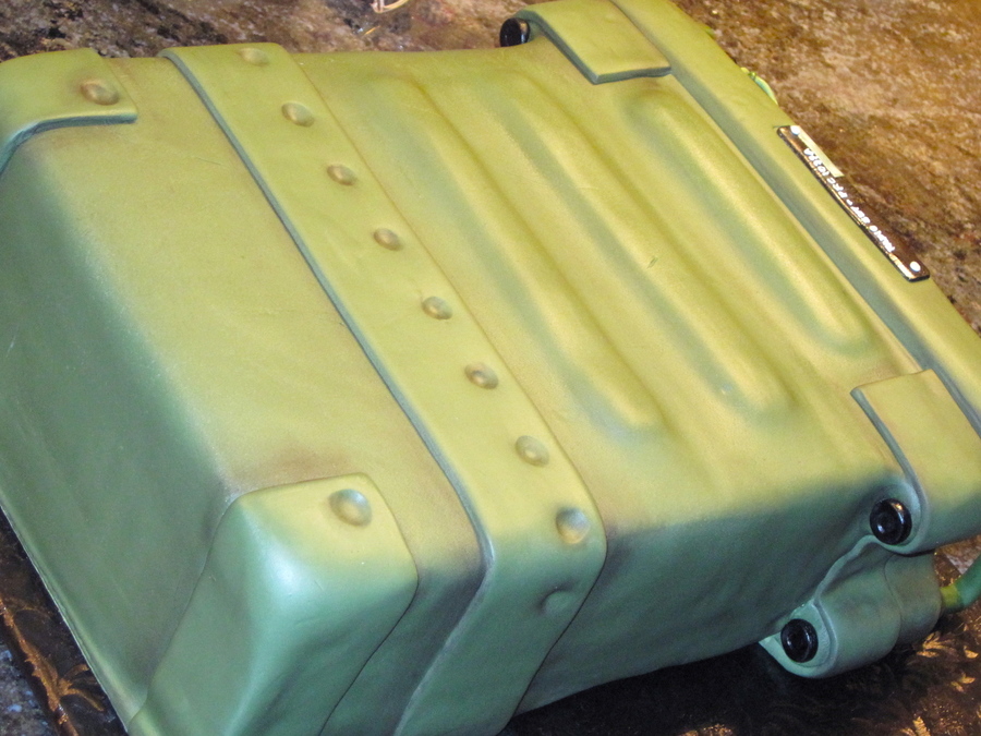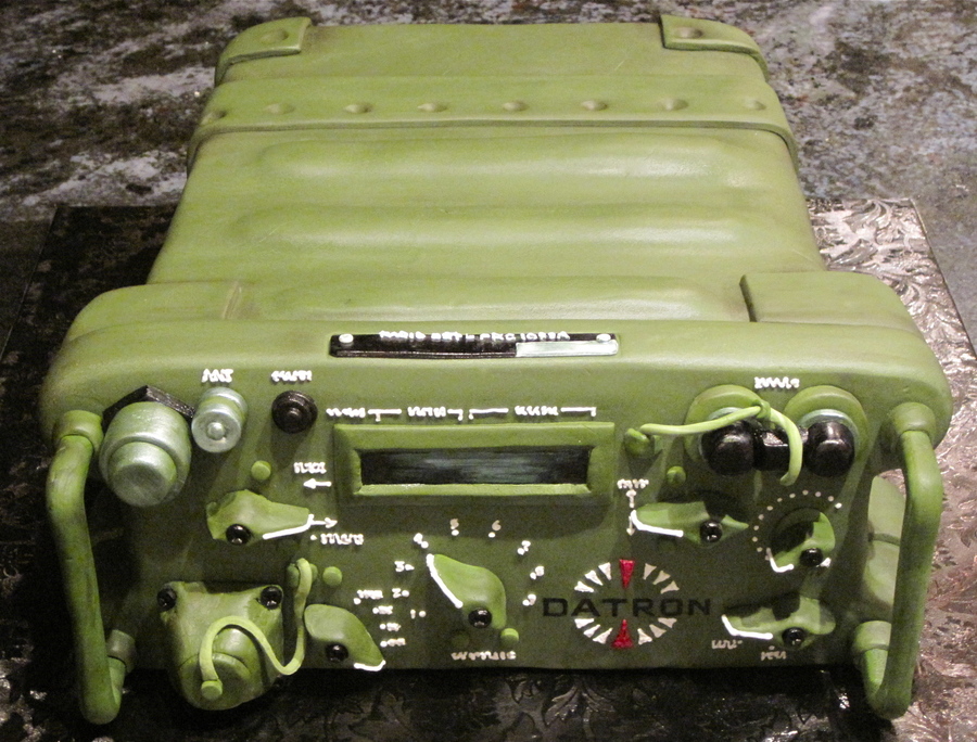 This cake is a replica of a field radio manufactured by a local company here in San Diego. Five layers of white cake filled with lemon buttercream covered in colored fondant . All of the knobs, handles and dials are gumpaste and fondant. The logo was painted on with food coloring and all of the white letters were piped on with royal icing. The aged appearance is created by using a sponge brush and powdered coloring.