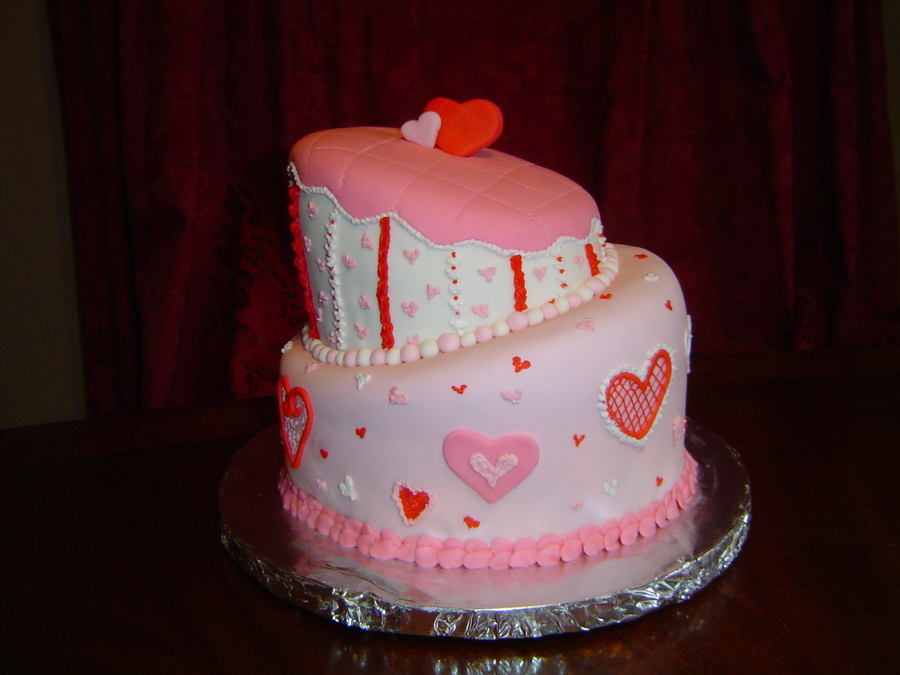 This was my first try at a topsy turvy... I didn't taper the sides! 6" rounds on 8" rounds, covered in fondant, decorated in buttercream and fondant. TFL