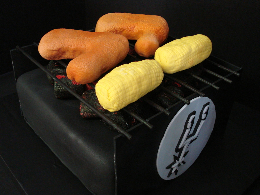 The cake is yellow cake with chocolate ganache filling and is covered in fondant. The grill sides and back are fondant panals with a fondant Spurs logo on each panal. The coals are marshmallows painted black and airbrushed red to make them look as though they are burning. The bars are food colored dowels. The chicken and corn are airbrushed fondant covered Rice Krispie Treats.
