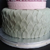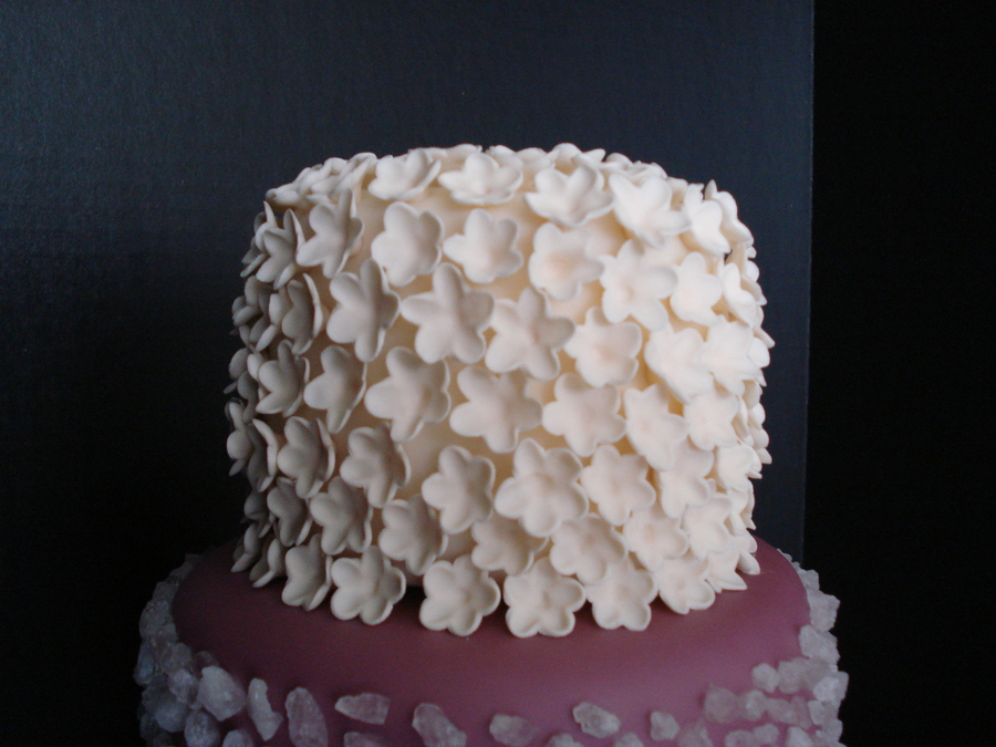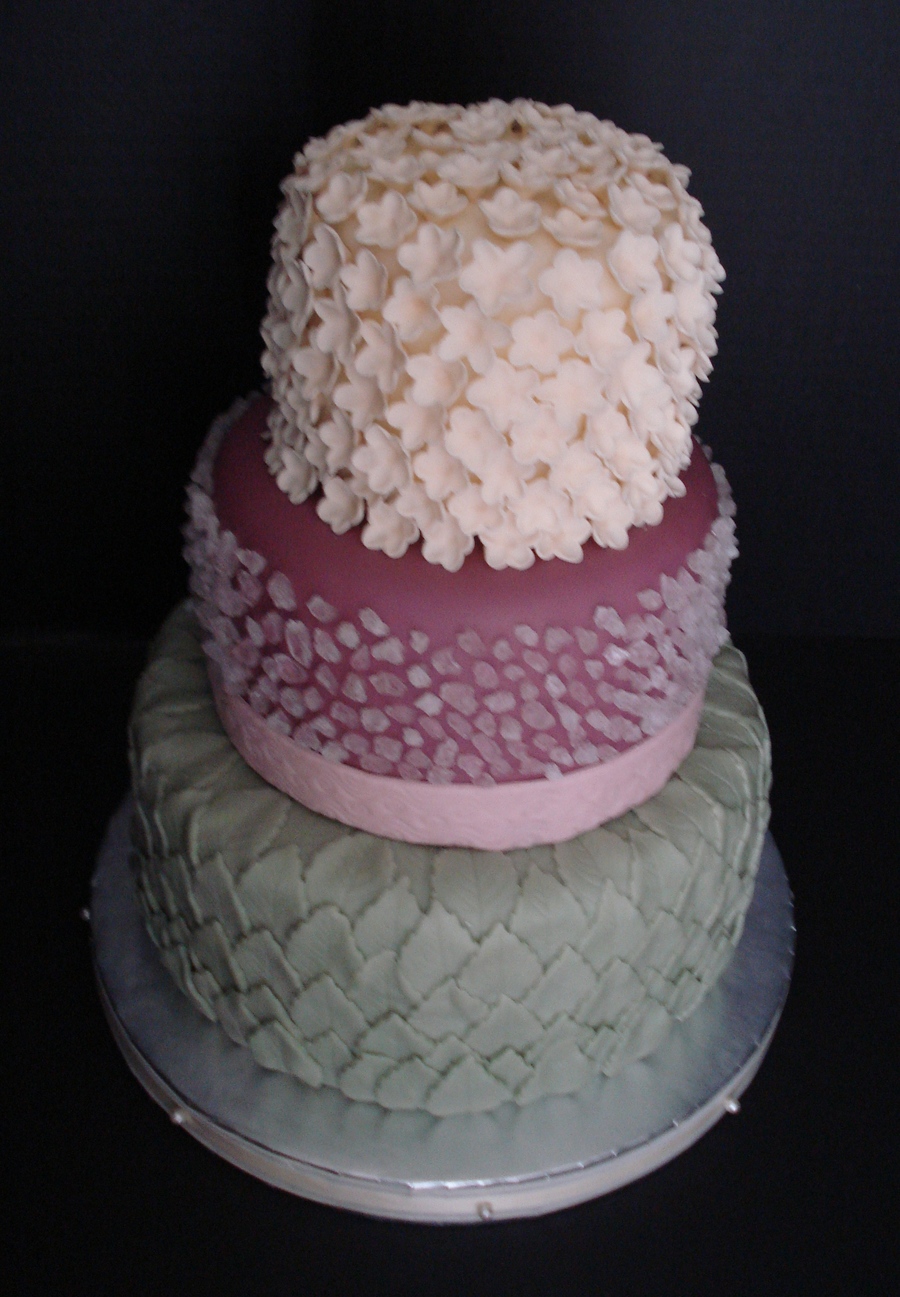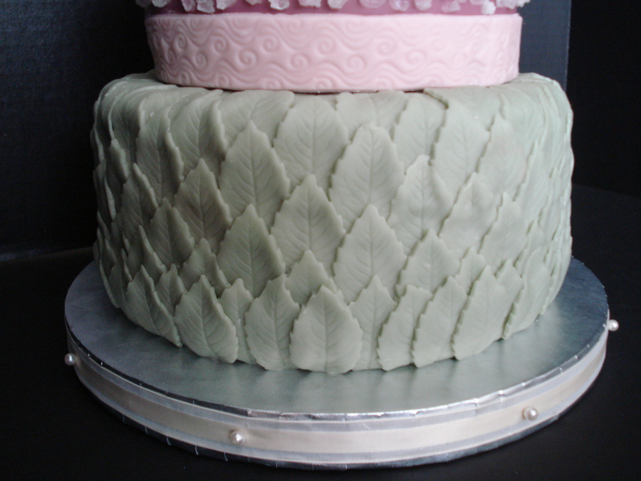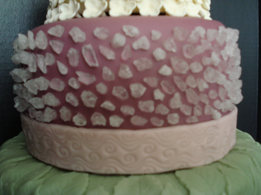 This is the first wedding cake I've done and I'm honored that it was for my brother-in-law and new sister-in-law! This was inspired by a Lovin Sullivan Cakes design she found in a bridal magazine last year. It was almond cake with raspberry cream filling, buttercream and fondant. The top tier is covered with hand made blossoms. The middle tier had sugar crystals and an embossed fondant band. The bottom tier was covered with cut out fondant leaves.