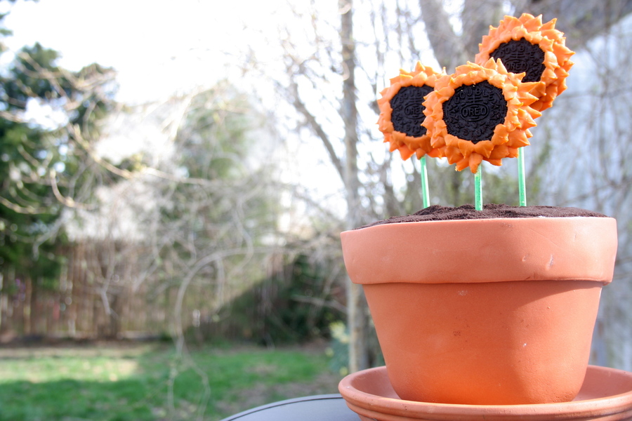 I made this flower pot cake by baking a pound cake in an actual flower pot BUT just for shape! I took the cake out and then covered it in terra cotta colored fondant. The flowers are oreo's and royal icing. the dirt is also ground up oreos. The only parts that are not edible is the saucer and the flower stems