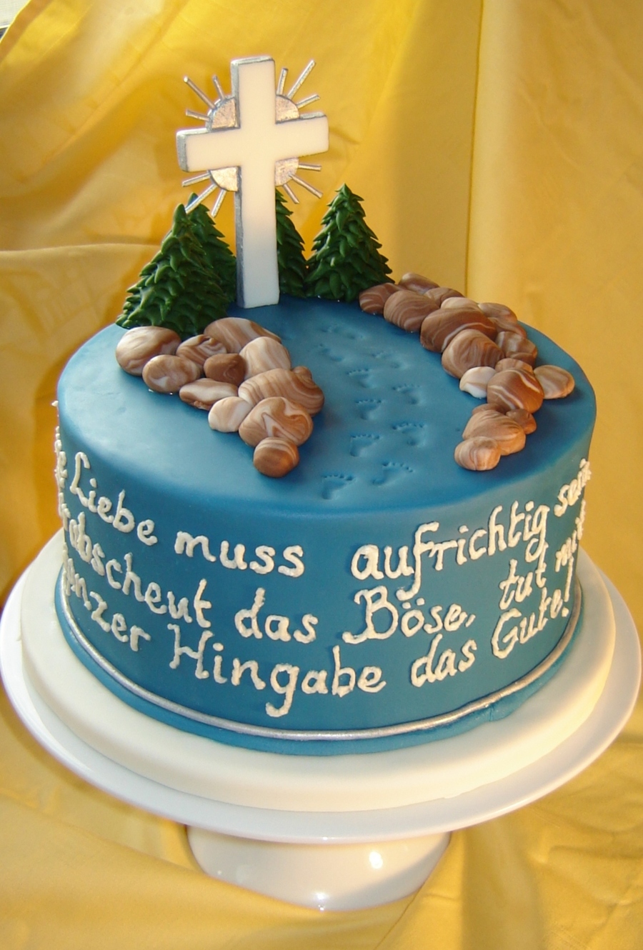 I think the footprints are my favorite part of this cake! The boy's mother wanted stones, possibly the idea of no stumbling stones on the path to God. So I made a path and lots of stones! The writing needs a little work but otherwise I think it turned out great. 9" vanilla cake with mandarin orange filling, IMBC and fondant. TFL!