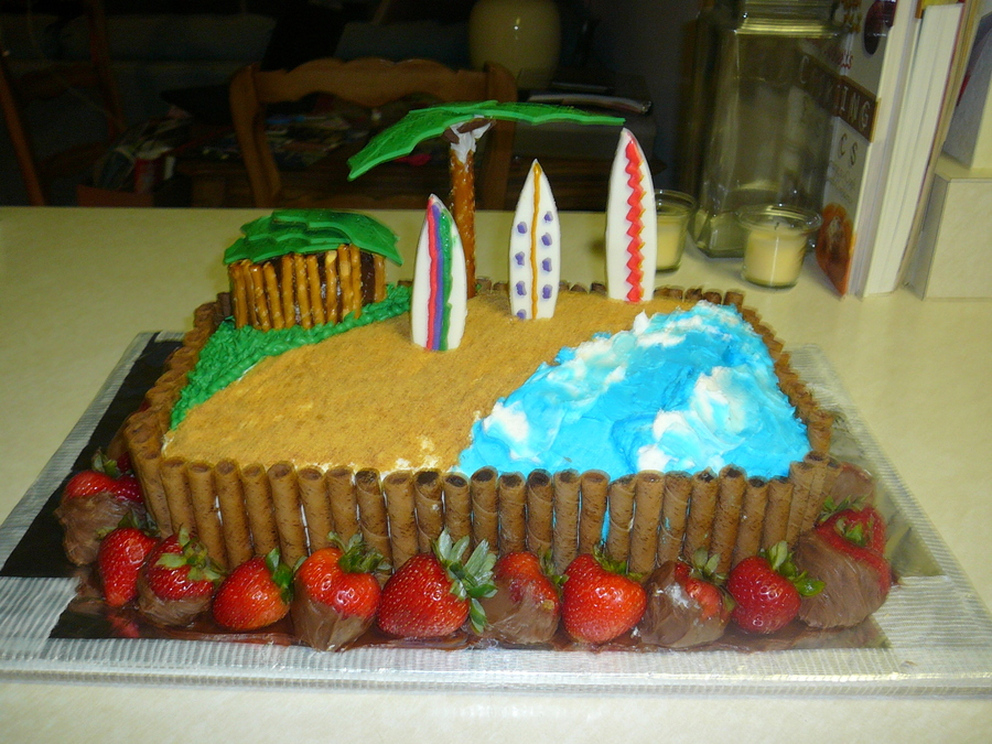 Strawberry cake covered in buttercream frosting. The sides are covered in pirouettes and the decorations are all fondant. The sand was graham cracker crumbles