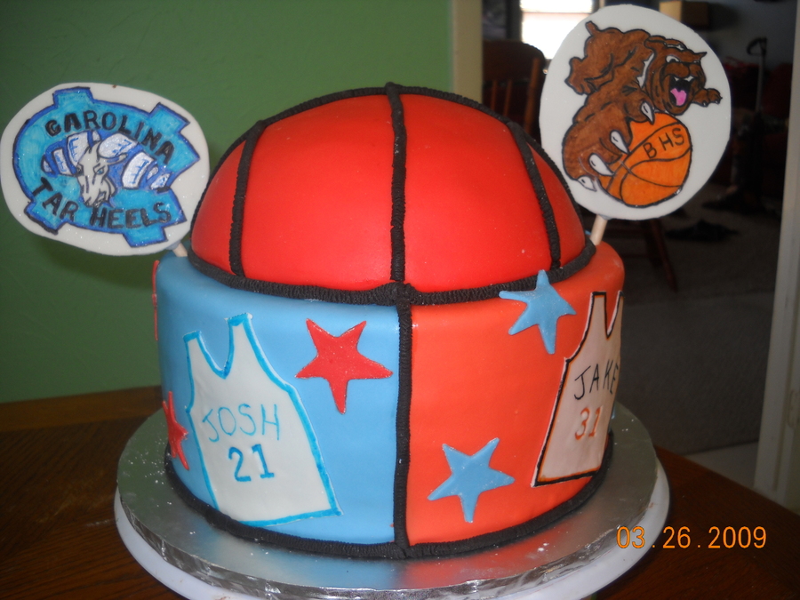 This was made for a friends sons birthdays. He wanted half for UNC and the other half for our local high school and to have something to do with basketball. It is WASC, filled with white chocolate mousse covered in MMF. I hand drew the logos with edible markers on gumpaste plaques. TFL