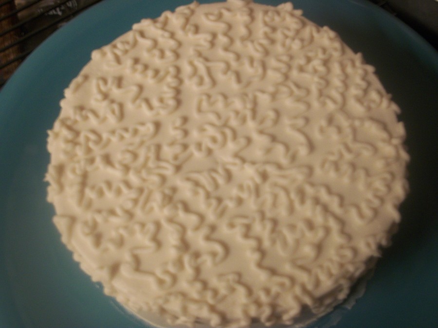 6 inch cake frosted with my version of Sugar sacks buttercream recipe. Cake was smoothed using the "Melvira Method". This my first atempt at cornelli lace.