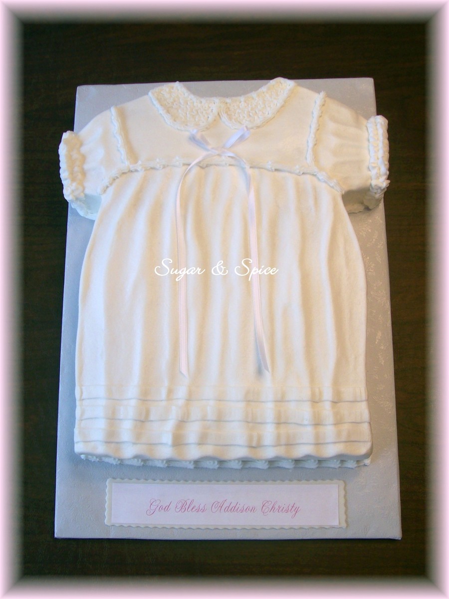 For a baby's baptism. Carved from a sheet cake and decorated in buttercream. Very similar to the design I did several years ago, but this cake serves a smaller number, so the "skirt" of the dress is shorter.