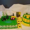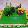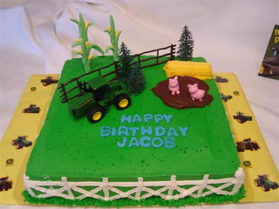 For a little boy who loves Tractors. Tractor, fence, and trees was from a cake kit. Corn stalks and Pigs are fondant. Hay bale is a granola bar covered with BC and using star tip #14.