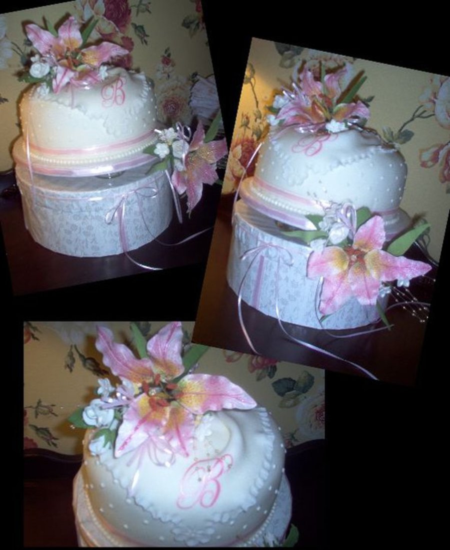 I really enjoyed doing this cake! I worked on the gumpaste flowers on & off thru the week. The cake is covered in fondant, the hanky is fondant that I handpainted a 'B' initial on. I hand rolled the fondant beads for the border below the pink silk ribbon. I wrapped the hat box with the same covering as the cake board and added the small bits of ribbon. The cake is sitting on 4 glass cake risers, otherwise known as votive candle holders, which work great for this effect! Thanks for looking!!
