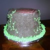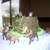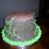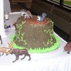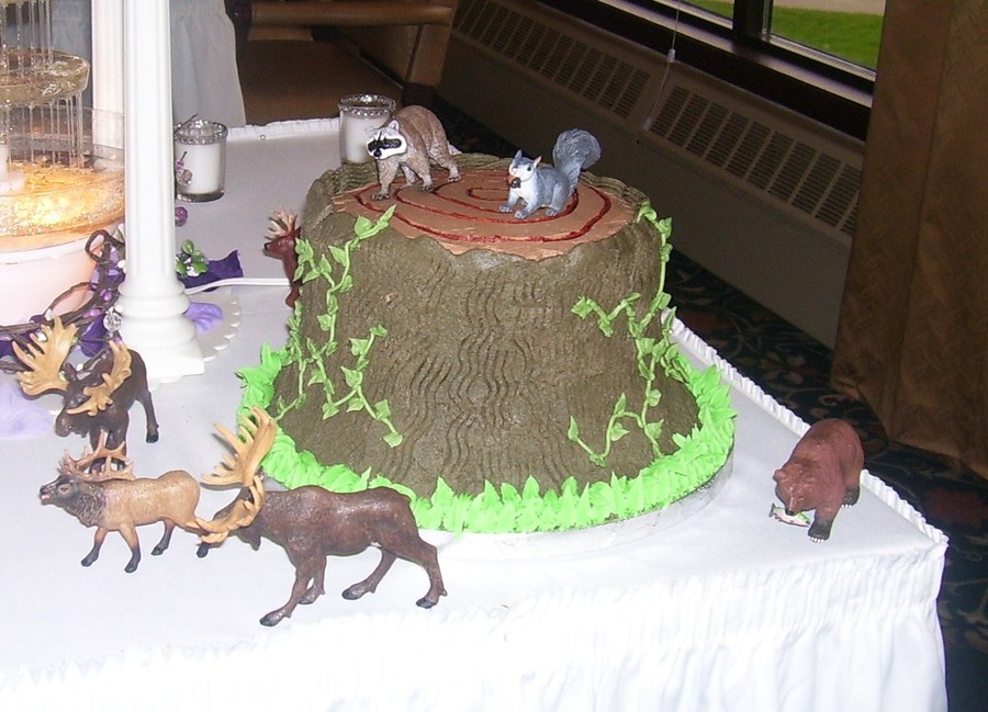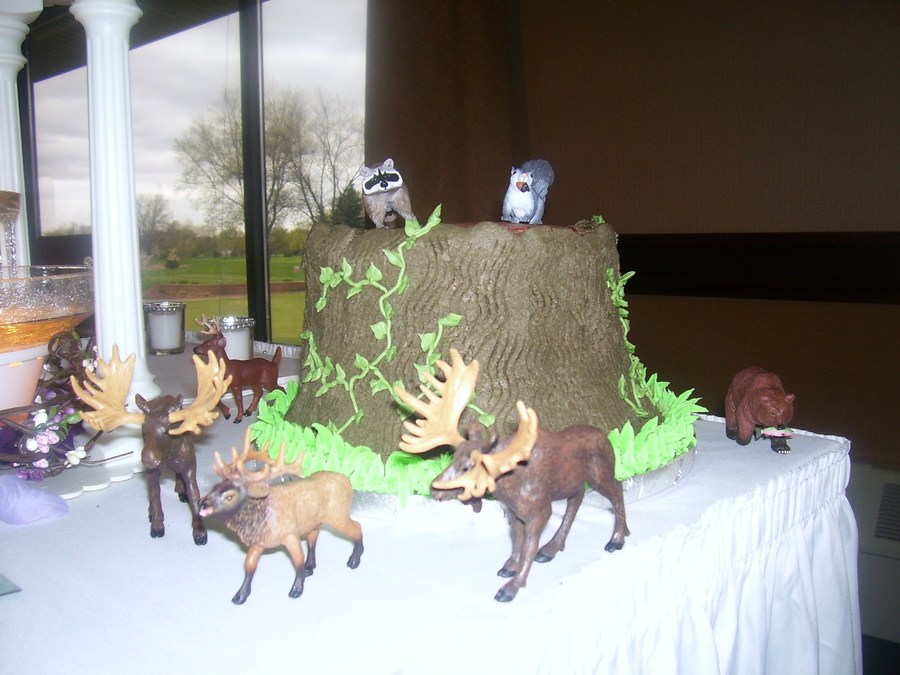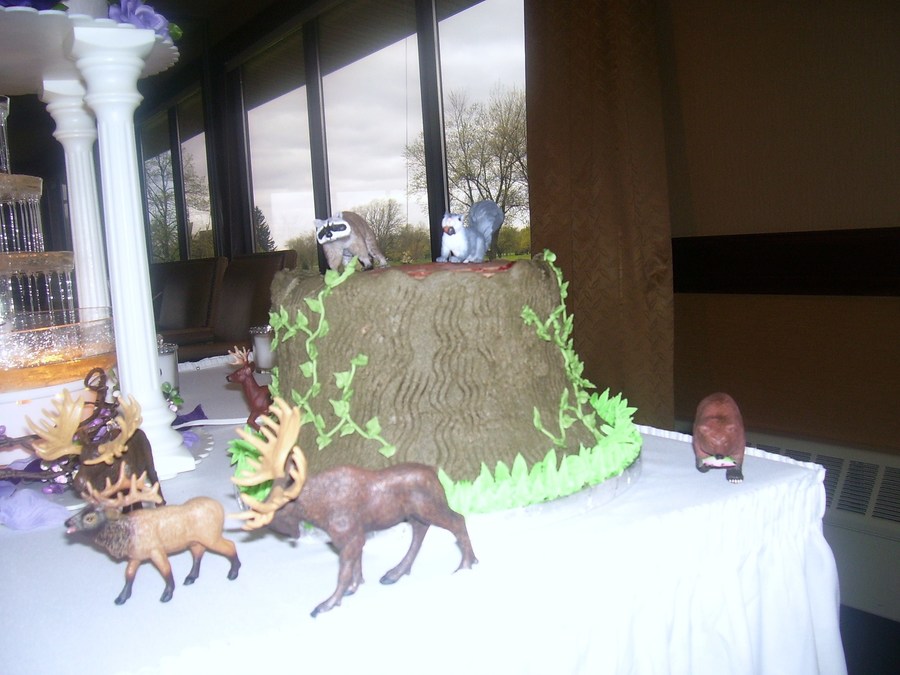 The couple wanted a tree stump cake that was german chocolate with the traditional coconut filling. They provided me the animals to stage around it. This is a 9" and two 8" round german chocolate cakes with homeade coconut filling iced in Godiva Chocolate buttercream. I was very happy with how it came out.