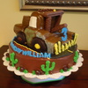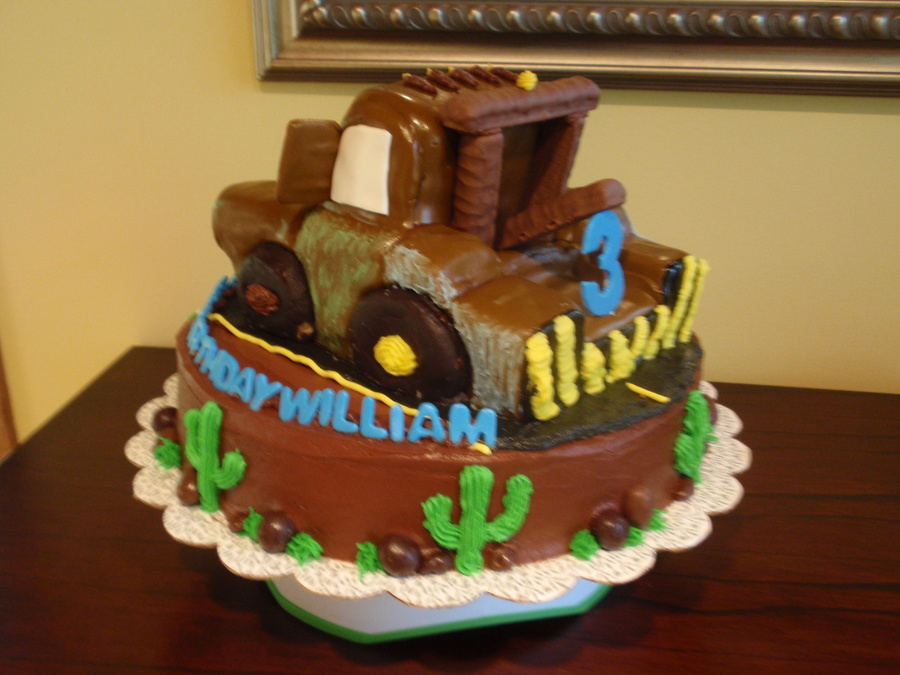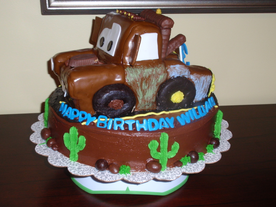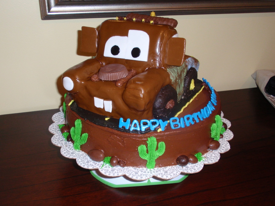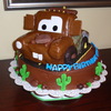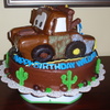 My first carved cake. Inspired by many cakes here on CC. Mater is covered in fondant. Donut wheels, candy bar accents. It was mid August and my fondant was melting terribly.