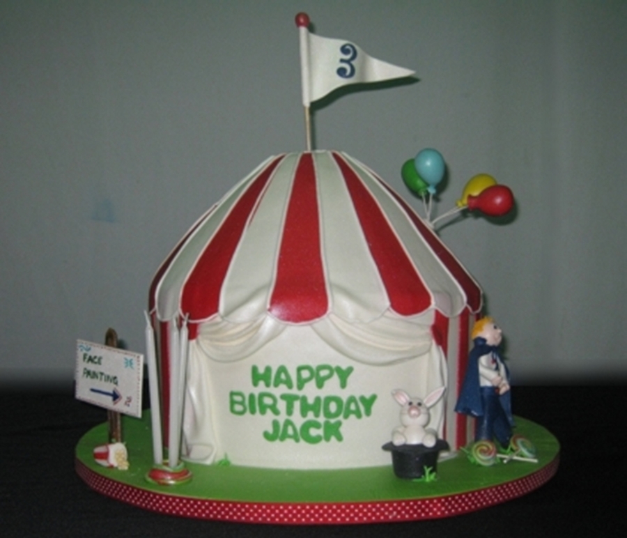 Carnival tent cake for themed birthday party. 10" high; 12" rounds. Had a tough time figuring out how to calculate the stripes on the top until I want back to high-school math! All figures and decorations (balloons, magician, rabbit in hat, etc....) are gumpaste. Thanks for looking.