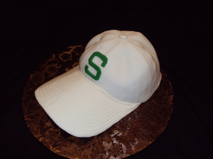 MSU hat. chocolate cake under fondant. bill is fondant over cardboard (method from confetti cakes). This was just a practice cake so i left the cardboard under the bill, instead of waiting 2 days for it to dry. thanks to springlakecakes for inspiration!
