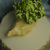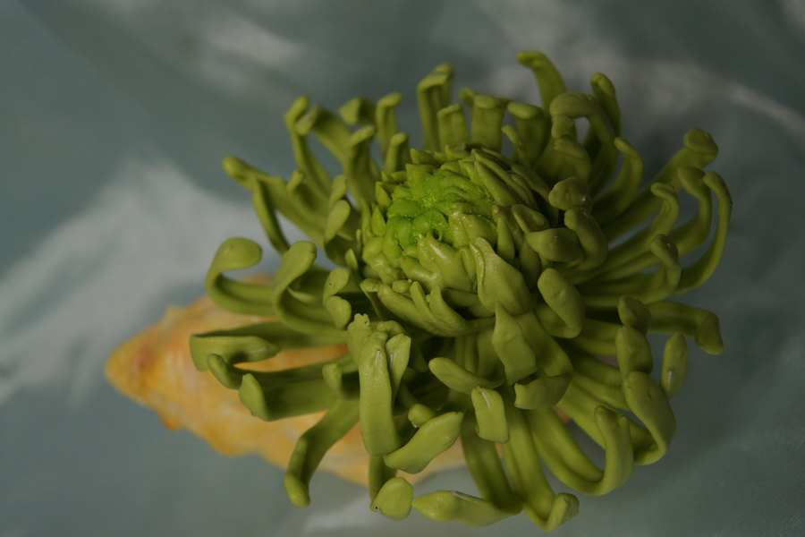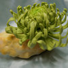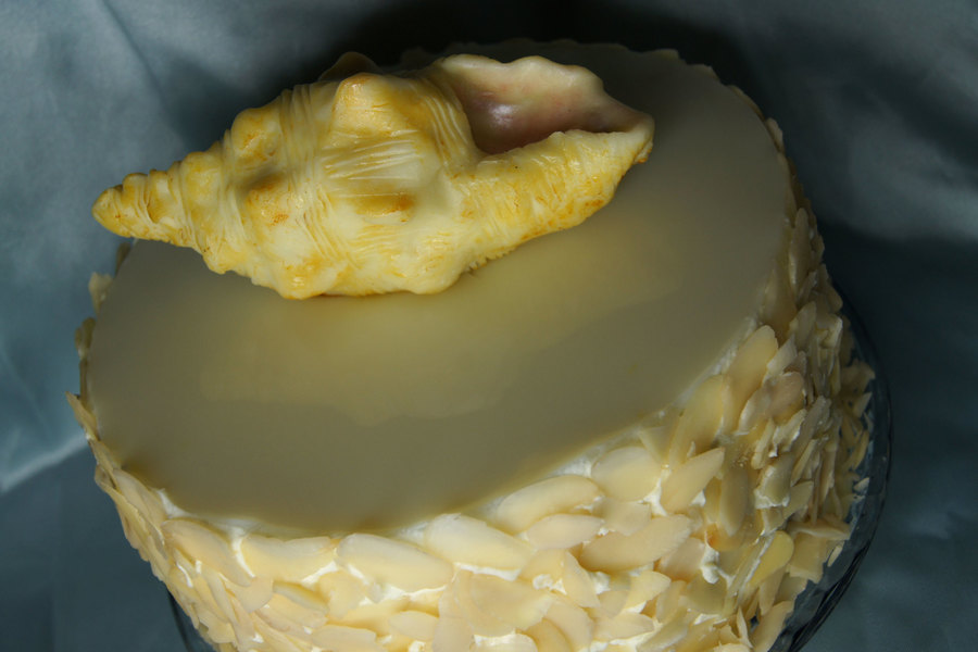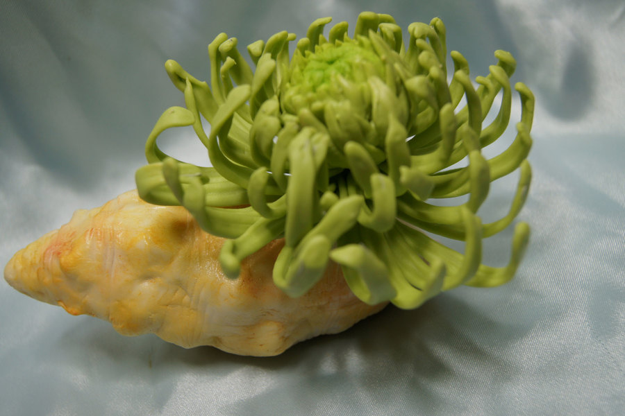 Gumpaste spider chrysanthemum in gumpaste seashell. On the cake is a chocolate seashell so that it wouldn't melt in contact with mirror glaze.