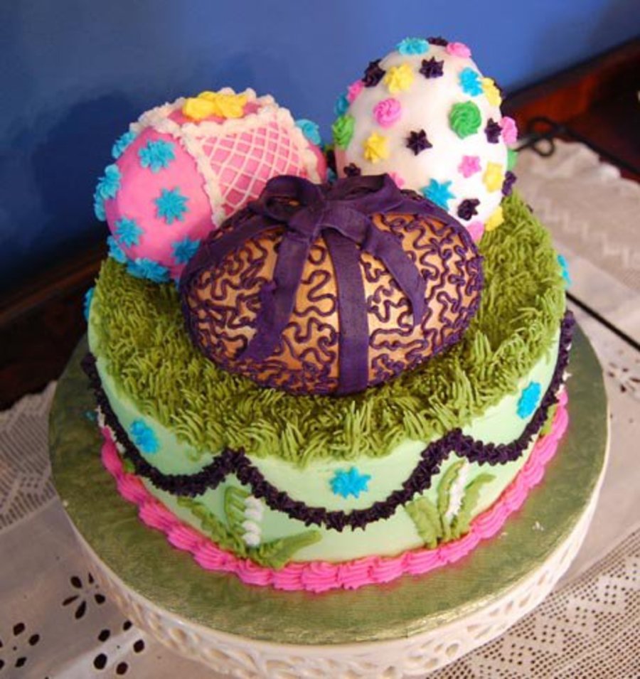 Round layers are carrot cake with cream cheese filling. Eggs are white cake. The whole thing is done in buttercream.