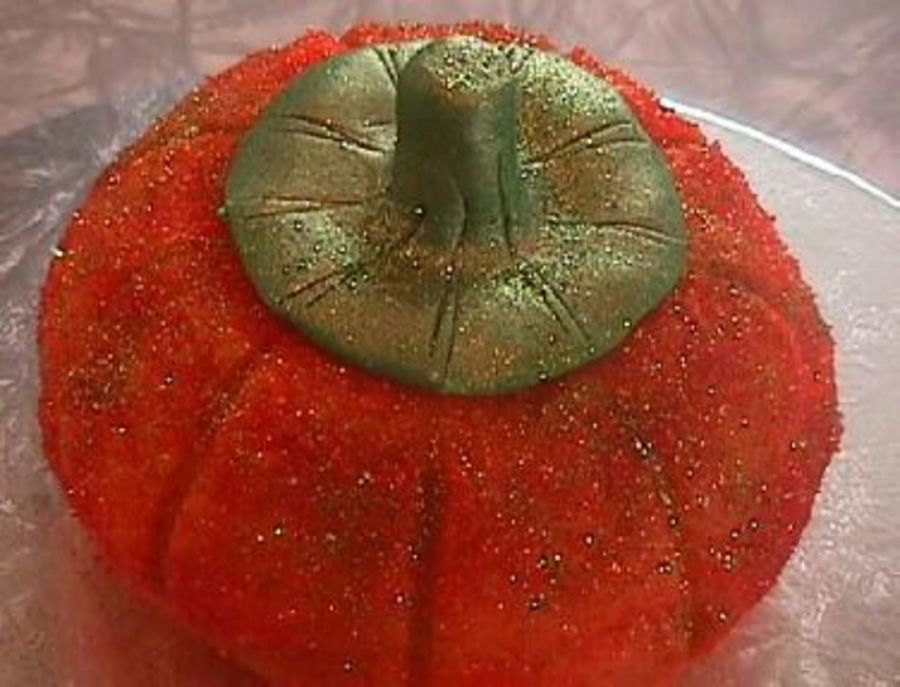 This was another birthda cake for Mum. It is 2 miniature bundt pans placed flat sides together, to make and almost ball shape. Buttercream icing, edible glitter and lustre dusts. Pumpkins stalk is marzipan.