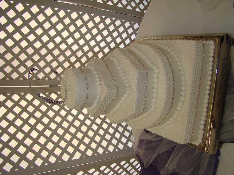 All buttercream wedding cake. 16 in square, 14 in round, 10 in hexagon, 6 in square, 4in round. Each layer has a ribbon of diamonds around them with dots on the top parts and a jeweled "C" for the cake topper.