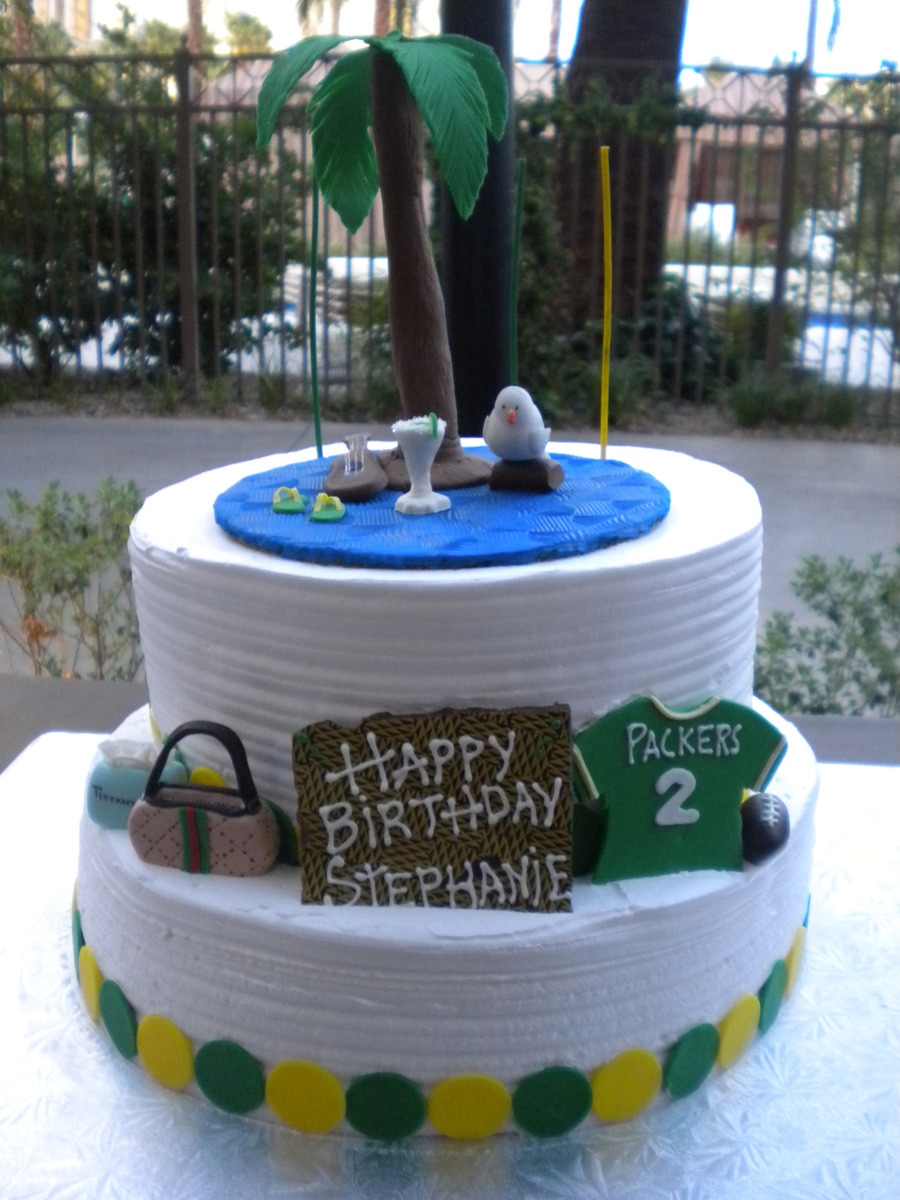 I was given free reign on design and got a list of the bday girls "likes" Tiffany Jewelry, Gucci Purses, Jimmy Buffett, The Packers, WIne & Cheese, Baking Utensils and Chapstick. Needless to say not EVERYTHING got incorporated just the most important stuff!