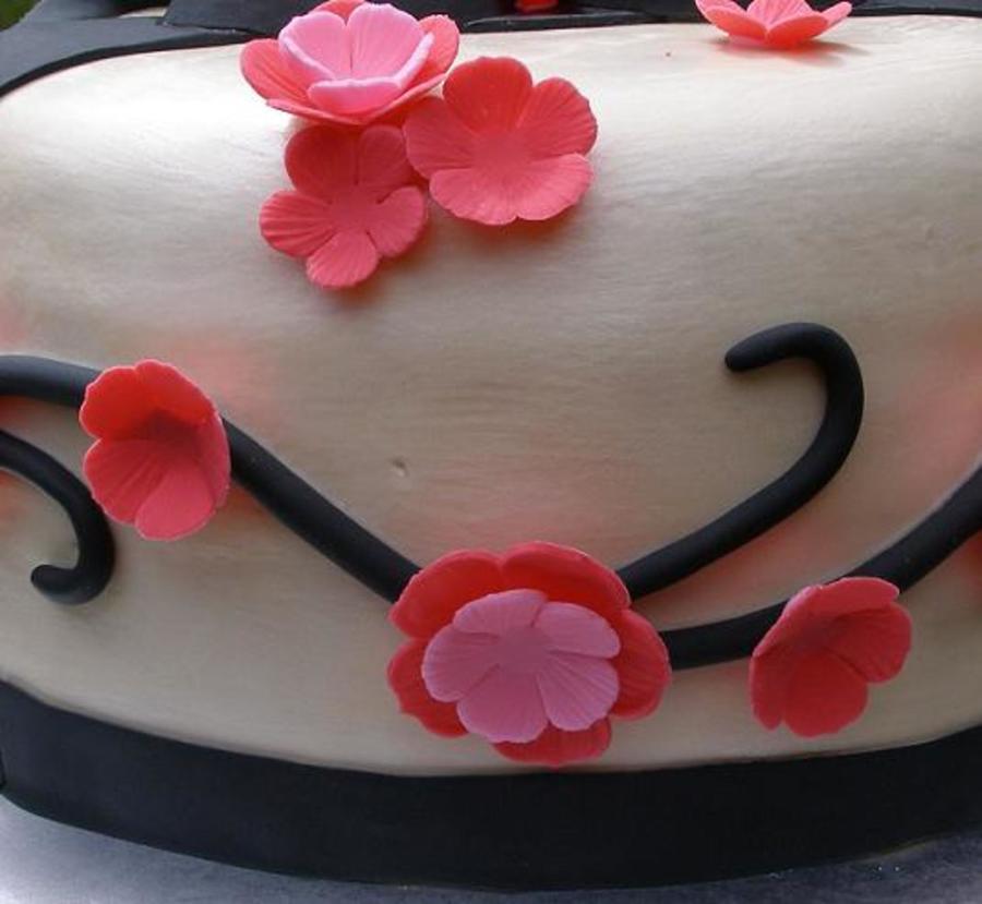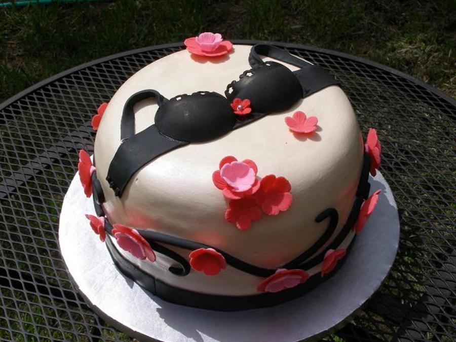 Yellow Sour Cream Butter Cake with Chocolate fudge butter cream and Satin Ice Fondant. 10" x 5";. Covered with Ivory fondant and painted with sheen air brush color. The decorations are gum paste/fondant. The design was for a Lingerie/Bridal Shower party. The flowers are loosely based on the flowers from the invitation.